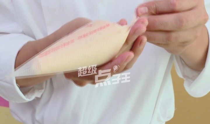给虾条做造型,我们需要用到裱花袋,在裱花袋下面剪一个小角,把虾蓉装进去。(油纸和裱花袋在烘焙店都有卖)▽