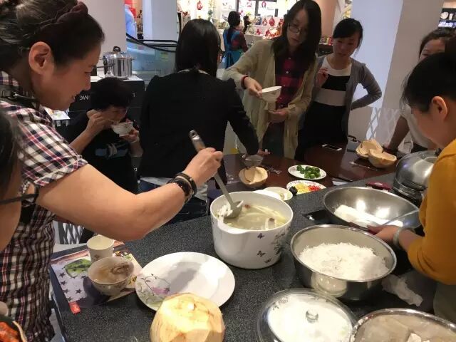 面对如此美食,小伙伴们当然早就按耐不住啦~大家纷纷品尝起这纯正的海南美食,异口同声的都说好吃!一位阿姨更是不停的夸赞丽花的厨艺,连喝了几碗椰子鸡汤,直呼正宗~看着自己精心制作的美食深受大家喜爱,丽花自己也非常开心噢~
