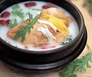 材料:牛奶500ml,椰子1个,鸡胸肉(去皮)250g,生姜数片(3~4人量)。