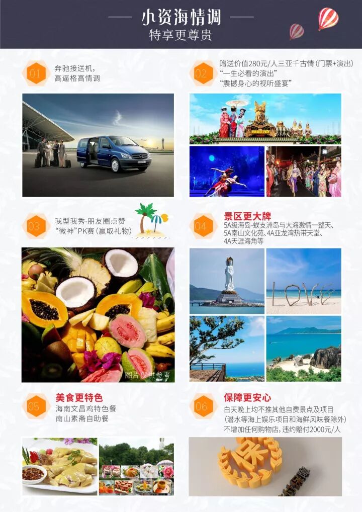 ● 小资特享:奔驰接送机,高逼格高情调,赠送价值280元/人的三亚千古情(门票+演出),我型我秀朋友圈点赞“微神”PK赛(赢取礼物)、全程品牌矿泉水1瓶/人/天、旅行社责任险;