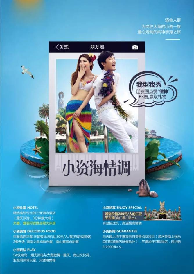 开启“我型我秀-微神”PK赛:发朋友圈点赞赢取热带时令水果。这不仅是一场团友间的互动活动,更是对小资海情调这段美好旅行的记忆。结果并不重要,重要的是我们有一颗热爱旅行热爱生活充满正能量的心。(3-9张图或小视频+正能量的配文,第四天晚上截止,积赞最多者将获赠热带时令水果一箱。)