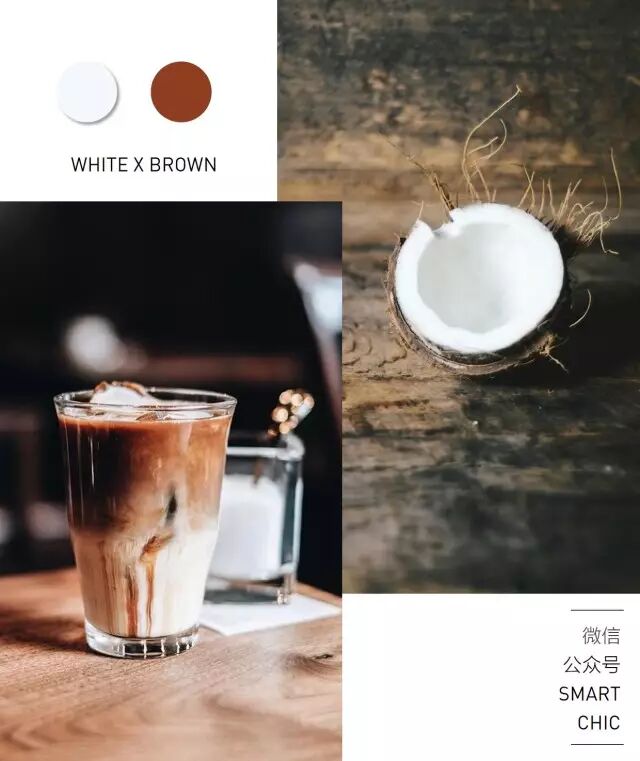 没有什么比开一个新鲜椰子、喝一杯冰拿铁更爽了(最近还流行椰子水和咖啡的混搭),诶,白色的椰肉和棕色的椰子皮就是天然的穿衣配色参考!冰拿铁进一步丰富了灵感,牛奶撞进咖啡,看两种颜色慢慢混合、过渡,也是一种赏心悦目。