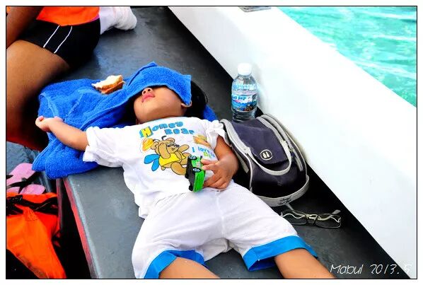 这个大胖子带着我去深海浮潜,越游越远,海浪也越来越大,明显感到体力不支,拼命往回游,好不容易爬上快艇,累趴了!边上有个小孩躺在甲板上睡着了,手里还紧紧拿住它的宝贝。