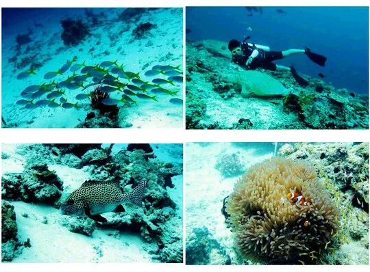 浮潜的时候来了一个渔民,他拿着铁叉从电动小船跳下潜到海底,我也跟着潜下海,只见他拿着铁叉不停的去戳珊瑚礁下面的一个洞,接着用手伸进去就拖出一只大鱿鱼,太不可思议了!