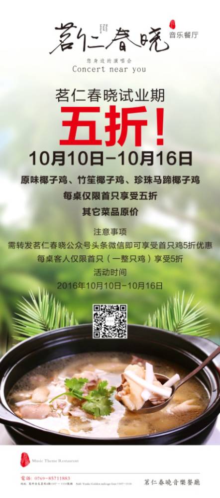 茗仁春晓试业活动第一波:椰子鸡5折!打足一个礼拜!