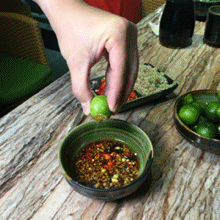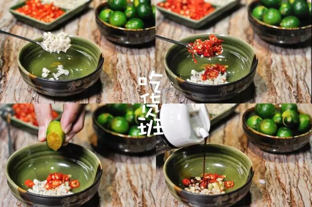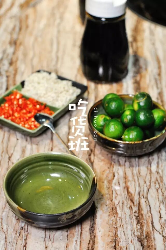 加入沙姜粒,小米椒,青金桔,酱油混调