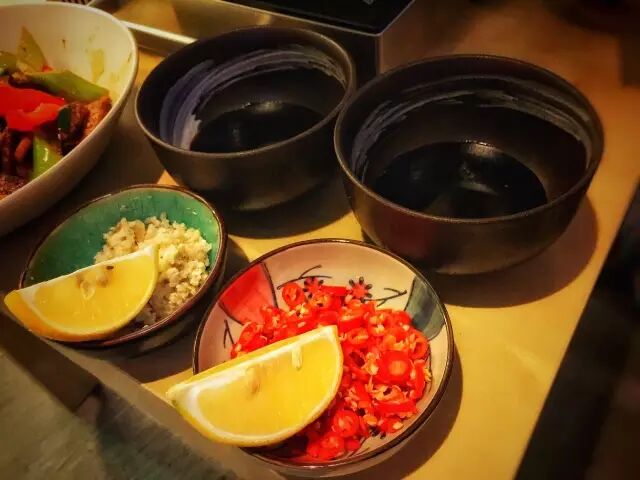 调制蘸料,生抽打底多倒些,青金桔头部一刀或者切半,将汁水挤入生抽里,沙姜末一勺或两勺,辣椒圈依个人喜好