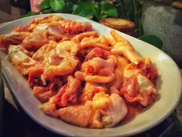 建议一整只或半只鸡为妙,主要是看多少人喽,两人份的话半只就可以了,尽量买到春鸡因为肉质鲜嫩,海南椰和海南鸡当然绝配了。,但是当地取材还是无法那么讲究,反正鸡不要太肥就是了,都是油煮出来的汤,腻腻的鲜甜味就没了。在这里,一定要叮嘱的是,斩鸡块,冲洗鸡肉,切小块,宽度最多不要超过两根手指,长度三根手指左右,这样小块的鸡放入锅中煮食,才不会煮老。比如
