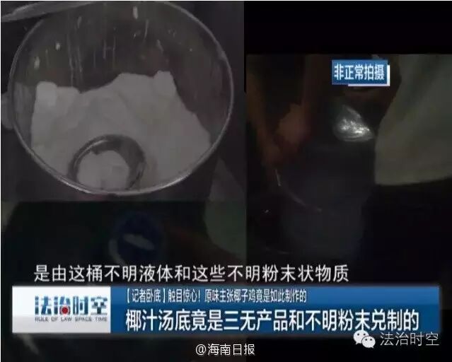 在调制过程中,厨工会先向桶中倒入这种不明液体,并加上饮用水,再加上这种粉末状物质进行调配,制成椰子鸡的锅底。可原味主张椰子鸡却对外宣传是从椰子中现场取出的椰汁。另外,厨工在试味道的时候,也是拿勺子舀桶里的汤底直接喝。