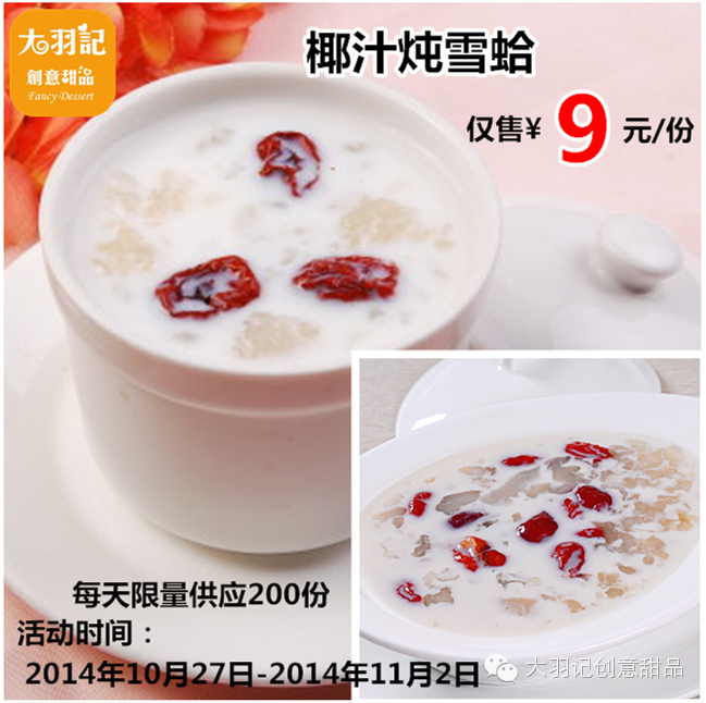 【仅售9元】大羽记椰汁炖雪蛤半价活动开始啦,香醇滋味,等你来品尝!
