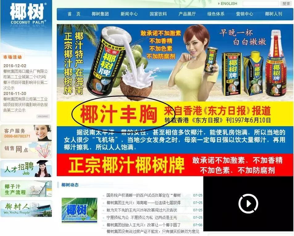 而在椰树集团官网首页上,最显眼的是“椰汁丰胸”这四个字。