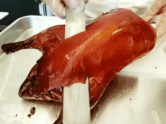 师傅手起鸭落,肉片层层叠叠摆入盘中,吃到口中皮脆肉嫩,发明烤鸭实在是人类壮举!