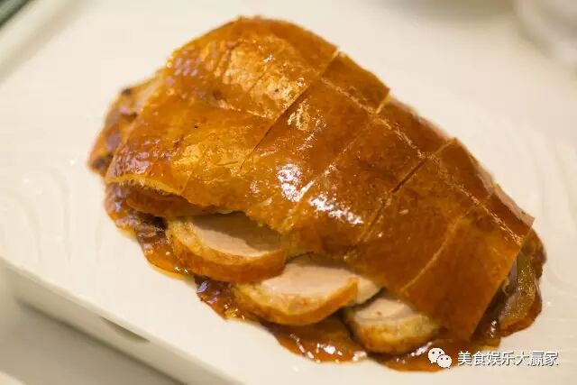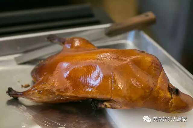 烤鸭整只上桌,色泽红棕油润发亮,远远就觉得香气四溢直流口水;