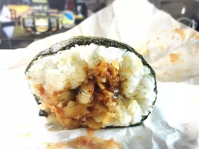 他们家用的米更像是平常吃的粘米,不会很黏软,蒲烧鳗鱼饭团里面有鳗鱼、肉松、薄脆以及少量蔬菜混着沙拉酱,让整个饭团都有料,薄脆没有因为酱汁变软而是使得口感更加丰富,倒是没有太尝到商家描述中的蒲烧鳗鱼汁的味道,基本都是沙拉酱的味道。