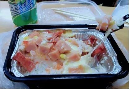 白米饭上铺上厚厚的芝士,大块培根,薄薄的火腿片,香甜的玉米粒,都在碗里啦~看来这顿“简餐”并不简单,还是很有内涵的嘛。