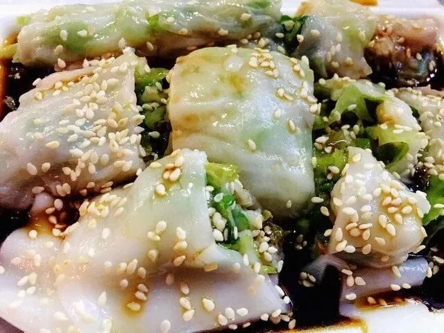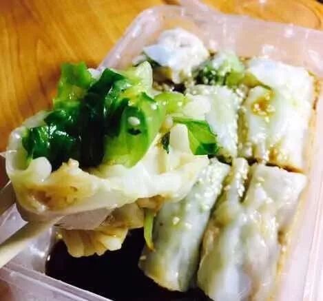 拿到打开的时候,真的是很惊喜,首先肠粉上面撒了一层芝麻,很香。肠粉很薄很剔透,做肠粉的米汤都是每天鲜磨的,可以看见隐隐的生菜,浇上店主配的酱料,非常有食欲的色彩搭配。