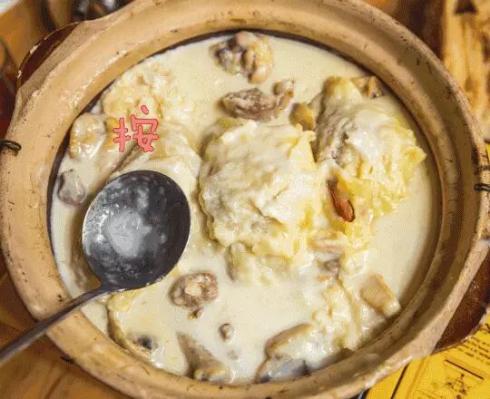 汤底由老鸡、猪手、脊骨、鸡脚、火腿熬制而成,再与榴莲在煲中纠缠一翻,甘香醇厚到惹人尖叫。