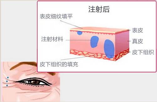 水光针是通过修复型胶原蛋白将透明质酸、PRP生长因子、botox等医学美肤营养配方注入真皮层,注射后皮肤紧致白皙、饱满水润。水光针利用负压multi针在皮肤真皮层注入人体因衰老而流失的玻尿酸、胶原蛋白、botox、PRP自体细胞等高端注射产品,使皮肤内吸收并储藏本身重量的1000倍的水分,唤醒细胞再生机能,重现修复皮肤枯萎断裂的细胞。在短时间内重塑紧致平滑富有弹性的肌肤。