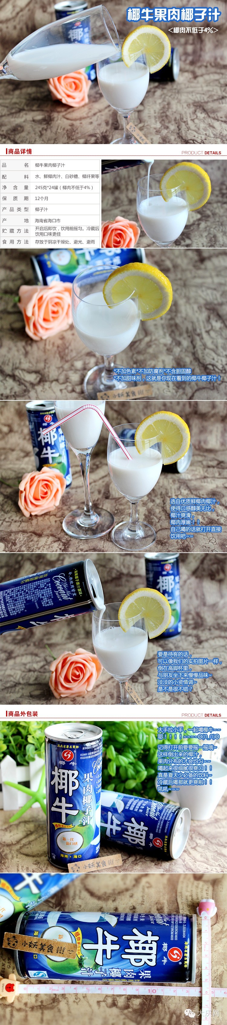 ★ 椰子汁是将椰子肉榨汁而成的天然饮品,含有大量植物蛋白以及17种人体所需的氨基酸和锌、钙、铁等微量元素,是迄今为止世界上氨基酸含量最高的天然饮品。其所含的维生素E能保持女性青春活力,镁可改善老年人的循环系统。