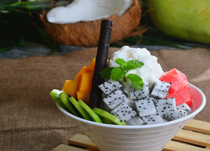 用鲜果榨汁,混合炼乳,再冷凝盘上迅速翻炒,成冰,再加入各种当季水果制成各种风味的炒冰。关键在于加入清香椰汁,清香甜润,皆为天成。炒出来的冰,质地细滑,入口即化。.