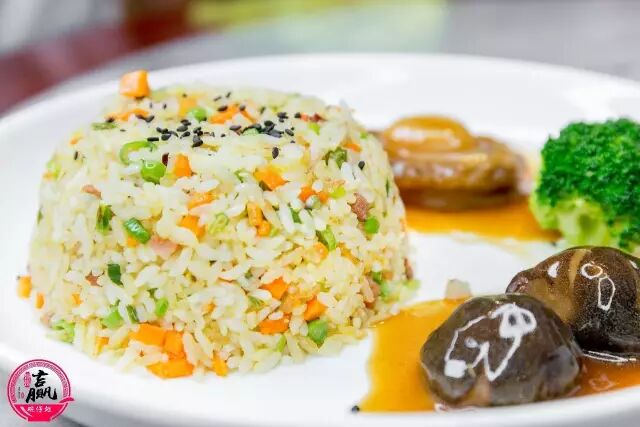 鲍鱼炒饭配有两块香喷喷的香菇和一块新鲜爽脆的西兰花,香菇被浇上鲍鱼汁,光鲜亮丽甚是诱人。