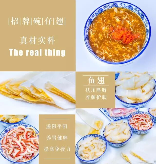 鱼翅取自软骨鱼类的鳍中的软骨,含胶原较多。加入虾、蟹来赋味可以使人体对鱼翅中的蛋白质更好地吸收。翅翅赢采用的都是精挑细选出来的多针少骨好鱼翅。