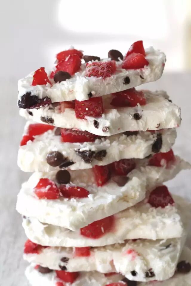 讲酸奶蜂蜜铺在锡箔纸的烤盘上,在上面撒上草莓、巧克屑、椰子粉,冷冻大约1小时;