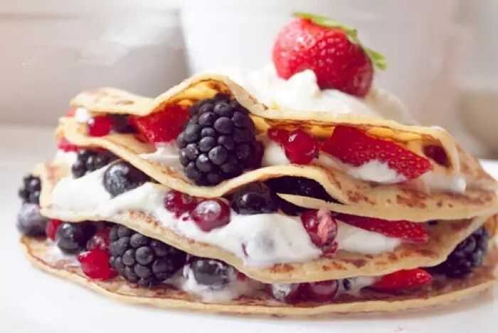 2.将酸奶和奶酪混合打发后抹在烤薄饼上;
