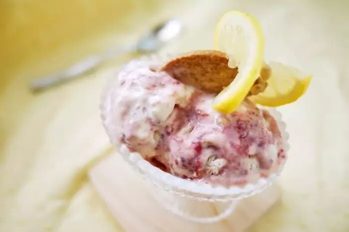 3.将解冻的樱桃碾碎,洒在制作好的冰淇淋上面,搅拌均匀即可。