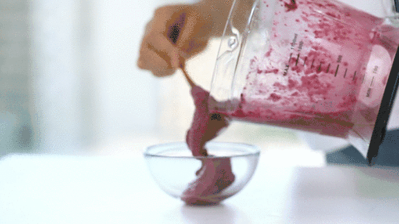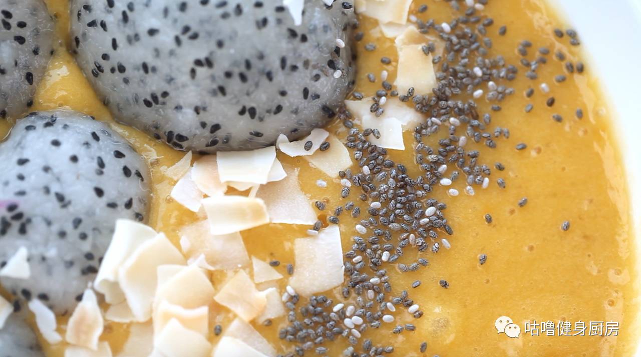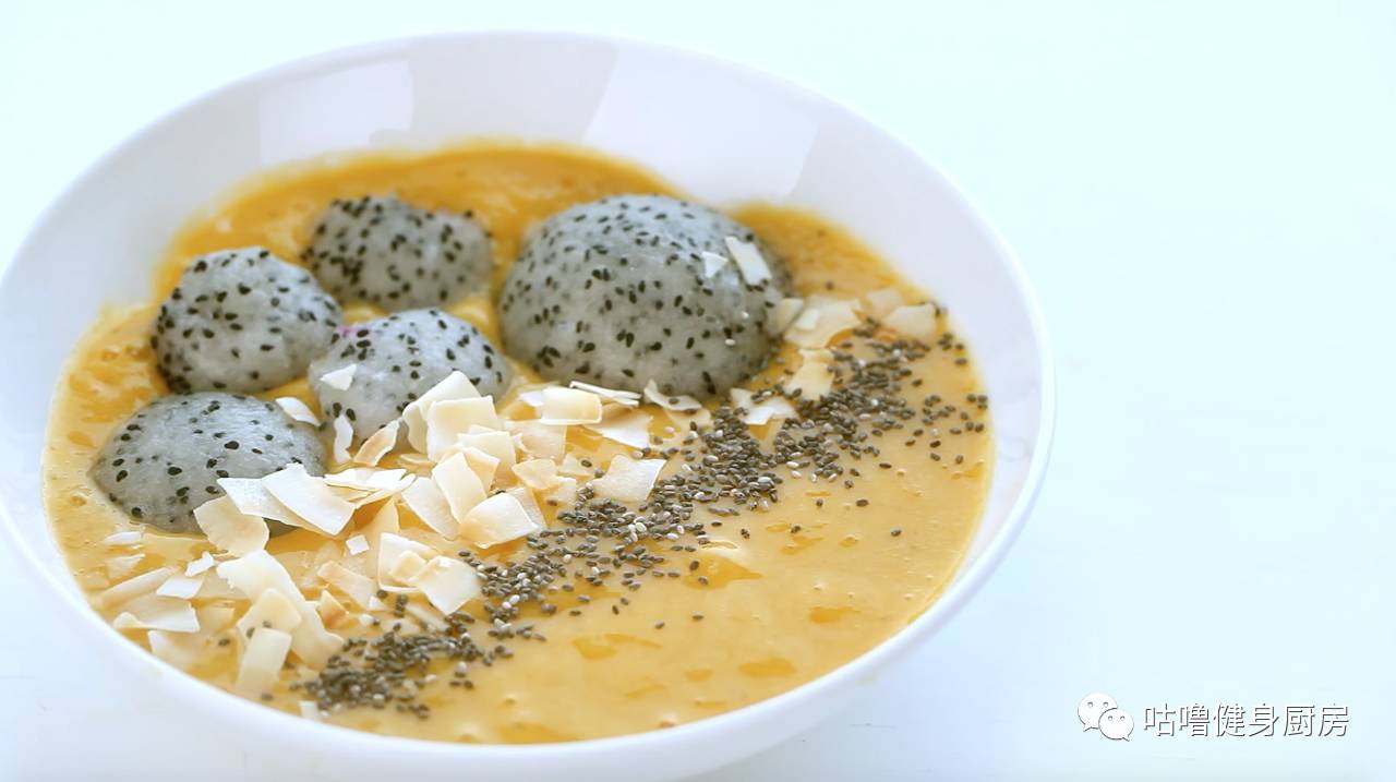 ▼ 1.把冻香蕉,芒果,和椰子水放进料理机中打碎成果昔。倒进碗里放上火龙果球,椰子片和奇雅子装饰