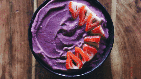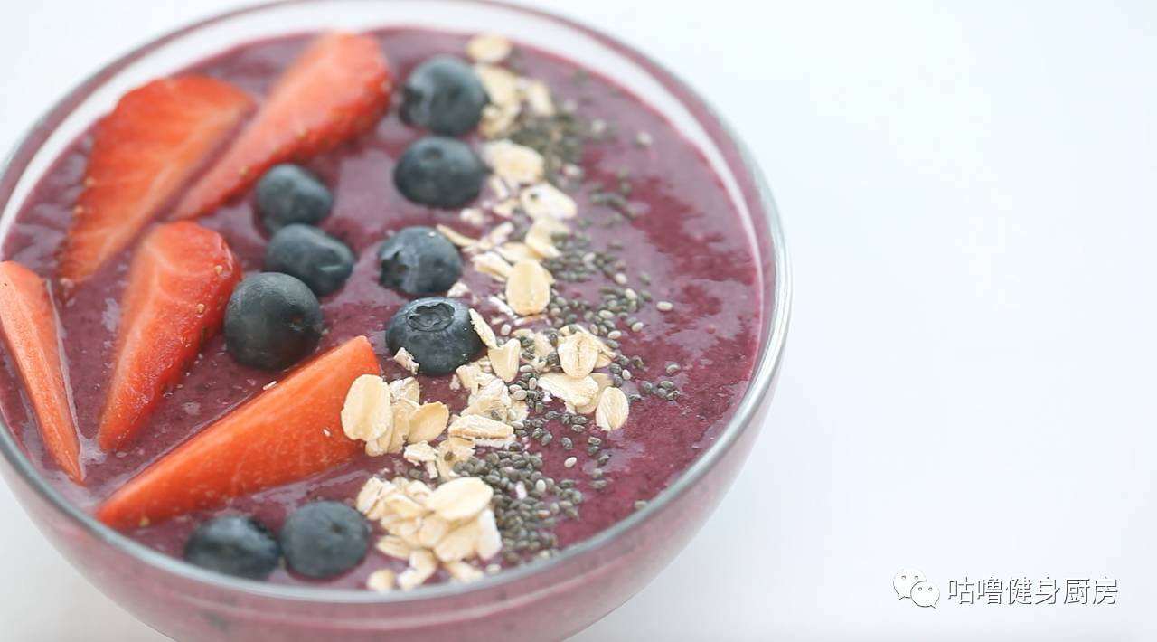 巴西莓acai口味和长相都跟蓝莓类似,但是巴西莓中的植物多酚比蓝莓更丰富,有天然的抗氧化和抗衰老的作用。而acai bowl就是用巴西莓和其他水果或者酸奶等等打成果昔,上面放一些燕麦和其他水果拌着吃。