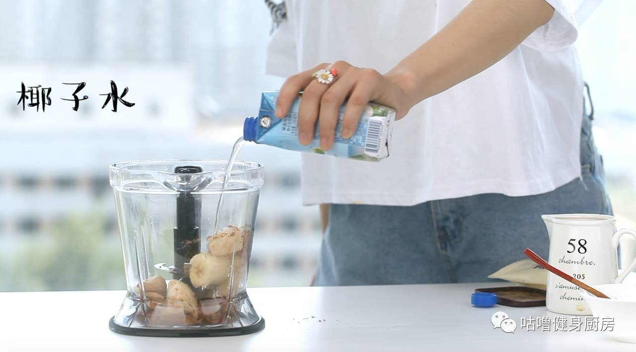 ▼ 1.把冻香蕉,无糖可可粉,杏仁和椰子水放进料理机中打碎成果昔。把做好的果昔倒进碗里,放上杏仁碎,玉米片和奇雅子装饰
