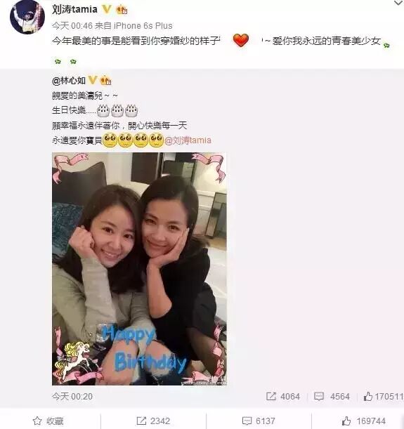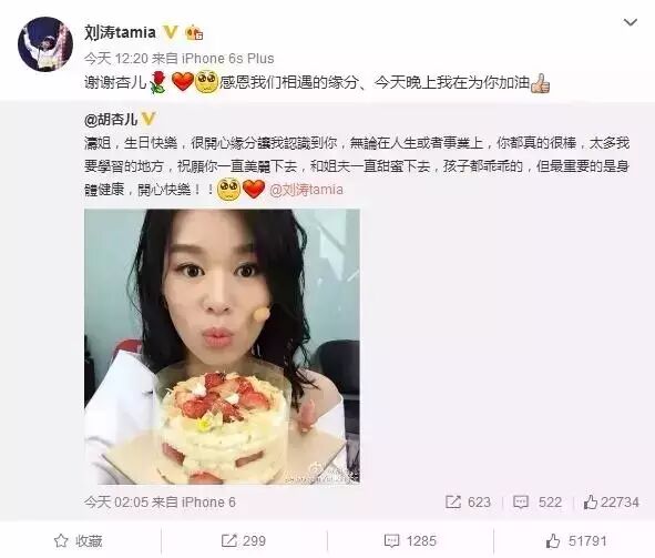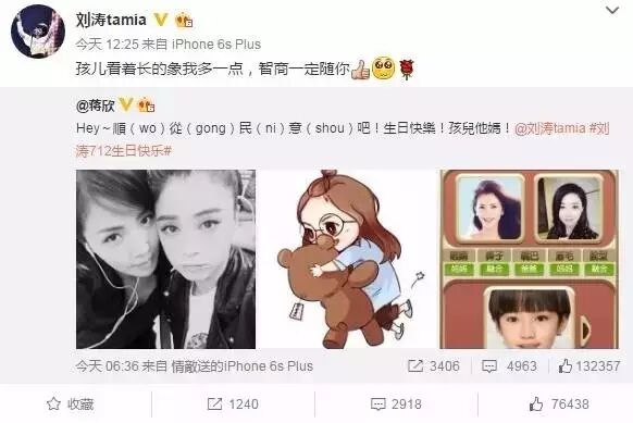 生日当天,不管是多年的好友,还是刚合作认识的新朋友,都纷纷送上祝福。有林心如,“欢乐五美”以及你们喜爱的小包总杨烁啊,还有同在参加《跨界歌王》的朋友秦海璐、胡杏儿、小沈阳啊...每一个祝福都温情而逗B,看得出都是刘涛的亲生朋友。