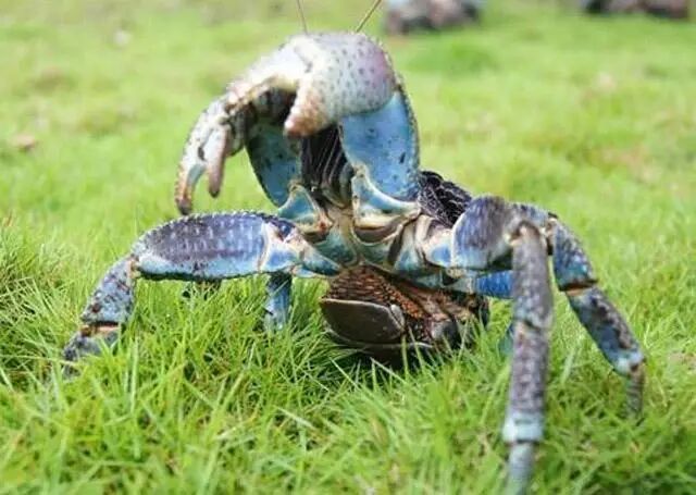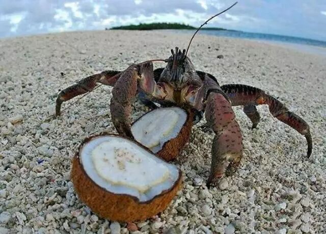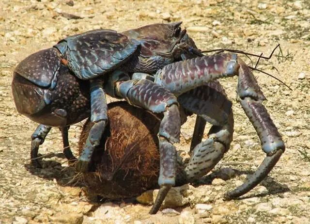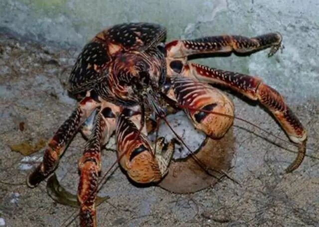 椰子蟹体型硕大,体重最高可达6千克,椰子蟹的外壳坚硬,有两只强壮有力的巨螯,是爬树高手,尤其善于攀爬笔直的椰子树,因为它们可以用强壮的双螯剥开坚硬的椰子壳,以吃其中的椰子果肉而得名。