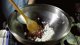 再加入牛肉、椰肉翻炒均匀。