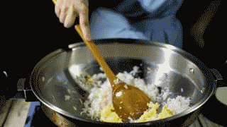 热锅下油,冷饭摊开均匀,