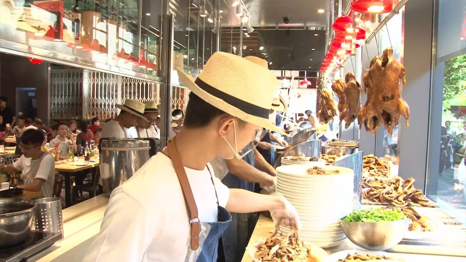 大大方方的把厨房透明化,不管是外边过路的人还是堂内的食客,都能清楚看到美食出炉的过程,也能吃的放心。透明的玻璃整齐挂着一排卤鹅,看起来也是相当诱人。
