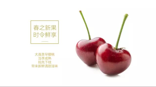 大连美早樱桃引种自美国,果型大,色泽美,肉质脆,肥厚多汁,风味酸甜较可口。