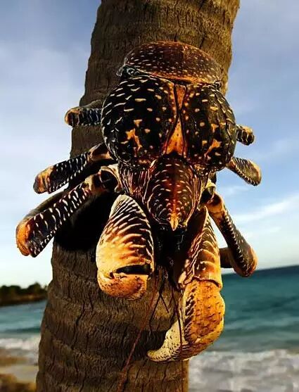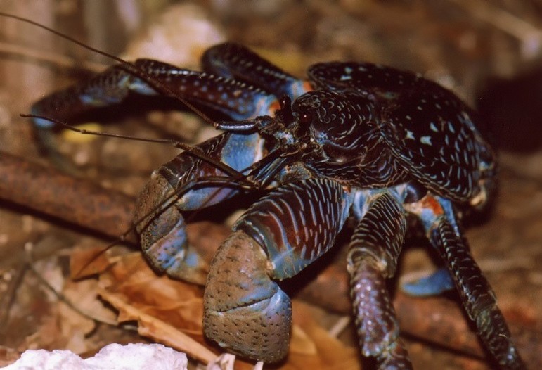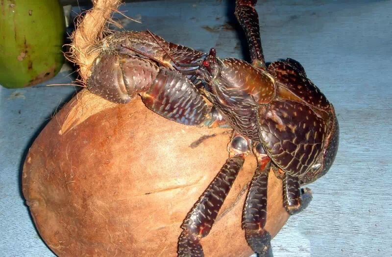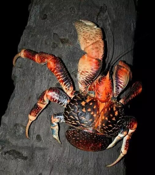 椰子蟹是生长在热带太平洋和印度洋许多珊瑚岛上的一种与众不同的寄居蟹,体型硕大,体重最高可达6千克,是现存最大型的陆生节肢动物。