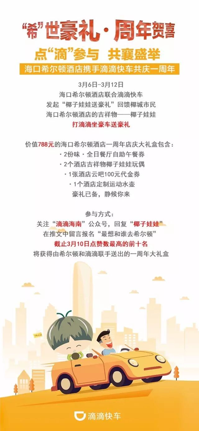 椰子娃娃开着滴滴快车,为你送上海口希尔顿酒店一周年店庆大礼盒!
