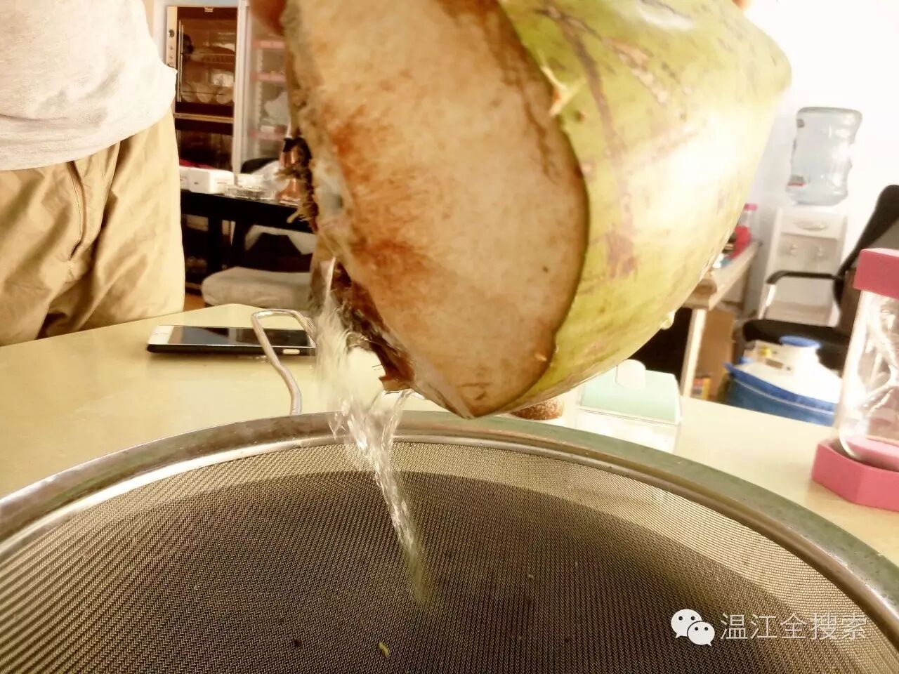 将不锈钢滤网置于砂锅之上,把砍开的椰子中的水倒入锅中,一个小锅需要两个。