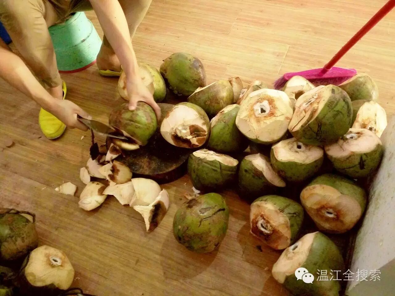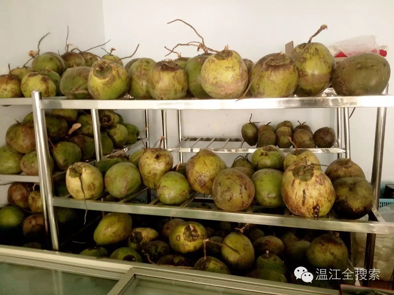 大厅的一个角落,不锈钢架上摆放着许多新鲜的椰子。