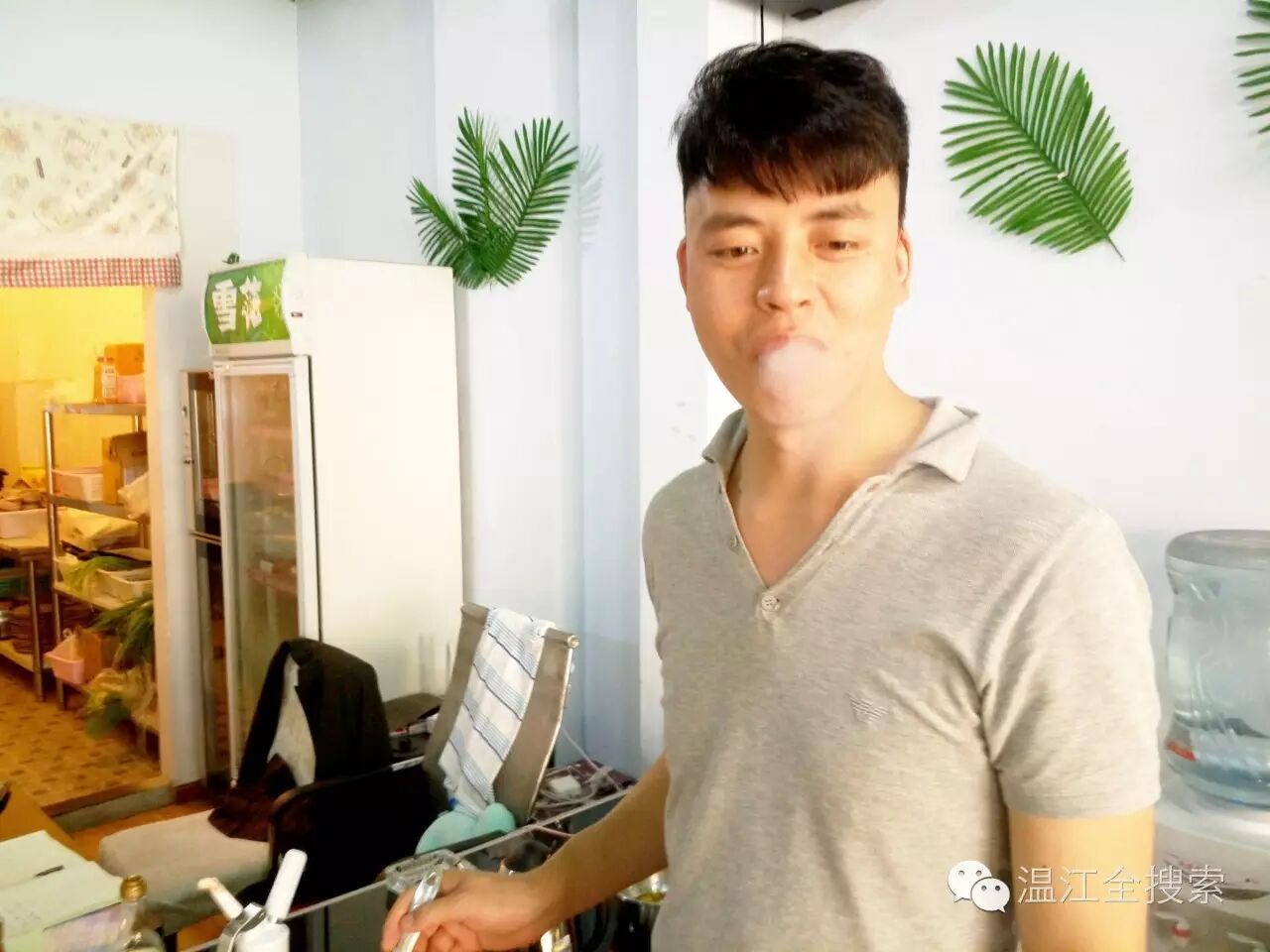 老板拿一个现场制作的冰淇淋,放入口中,除了能感觉到凉爽,还能马上吞云吐雾。