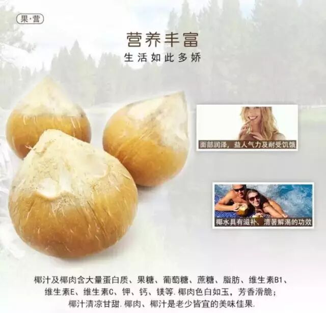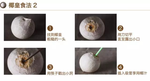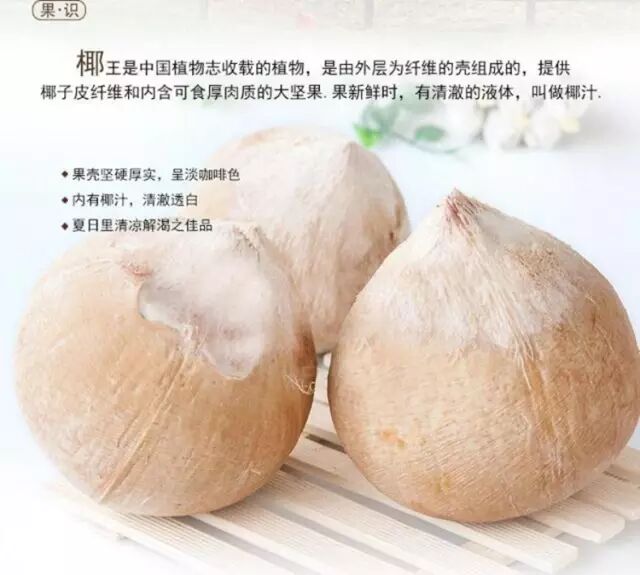 果壳坚硬厚实,呈淡咖啡色。椰皇内存有椰汁,清澈透白,甘甜爽口,味道比较清淡,是夏日里清凉解渴之佳品;紧贴果壳内壁还有一层厚厚的乳白色的椰肉,柔若奶油,芳香滑嫩,味甘、性平,取出即可直接品尝。