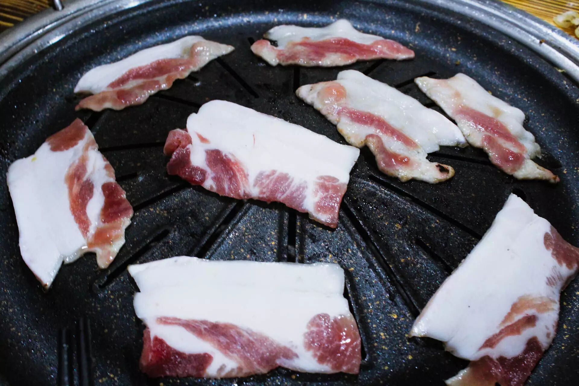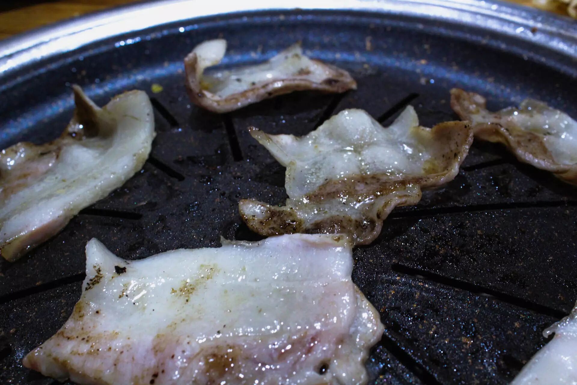 对于薄五花来说一定要烤的时间够久,等到把猪油全部逼出来之后,肉开始变得微微卷曲并且像是肉干的感觉,这样才是最香的时候。