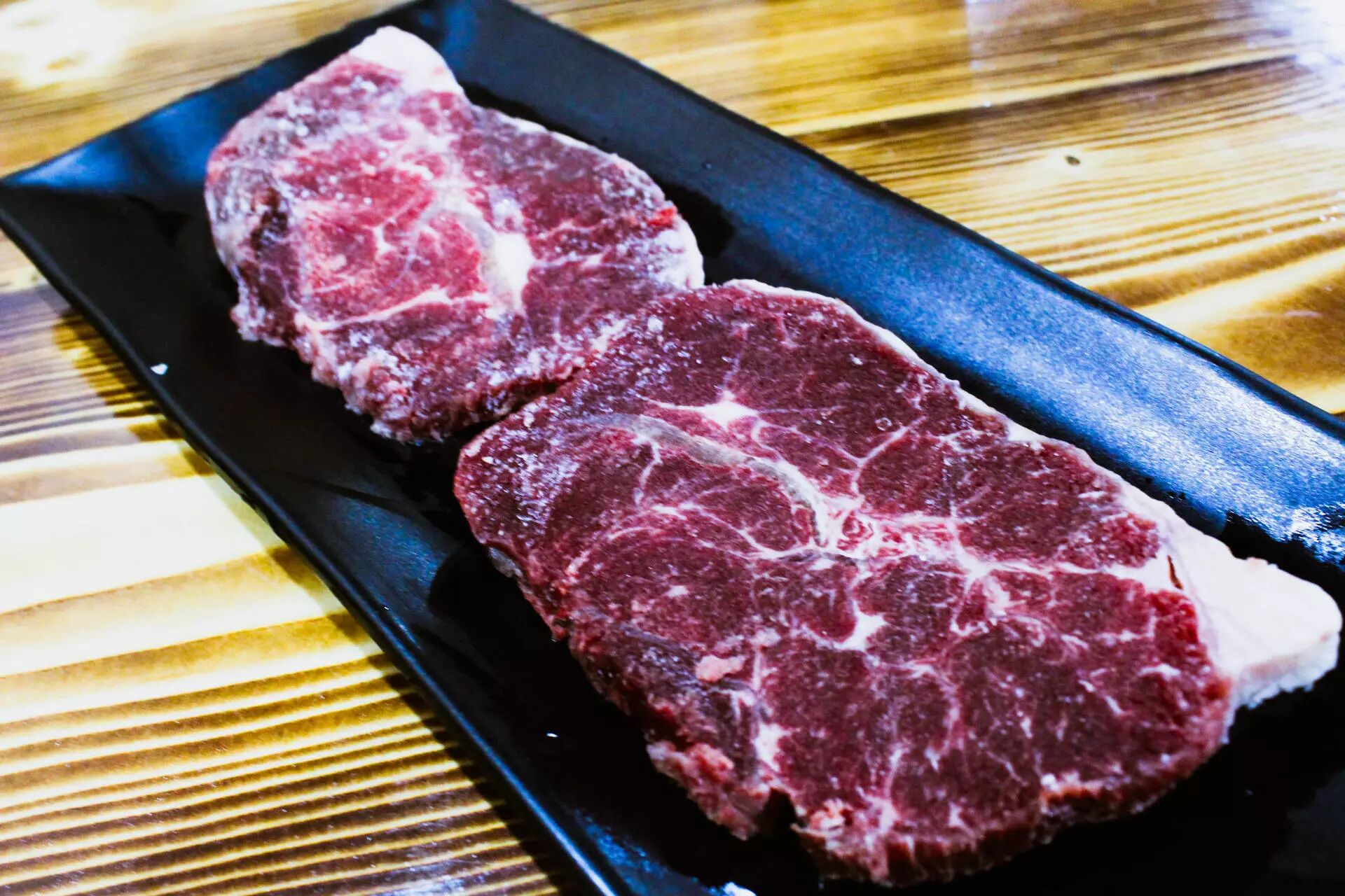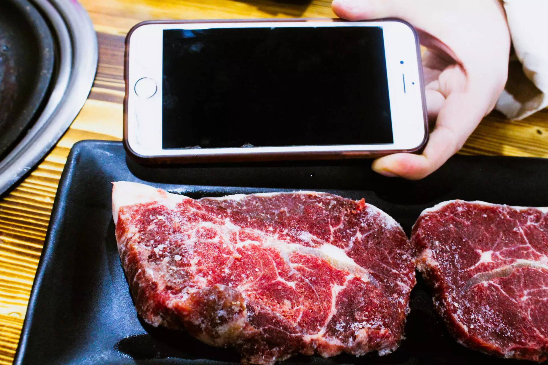 不愧是顶级的烤肉,油脂布满在鲜红的肉上形成了斑驳的花纹,一块肉堪比一部手机的大小,并且价格一点也不贵,可以说是良心价格了~