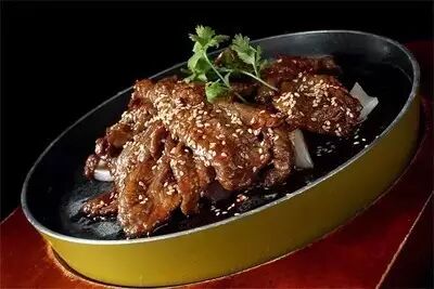 3、炒锅里放少许色拉油烧热后,下辣椒粉、花生粉、孜然粉和牛肉酱先炒香,烹入料酒并掺少许鲜汤稍煮后,再舀在石锅里的羊肉片上,最后撒熟芝麻并点缀香菜叶,即成。