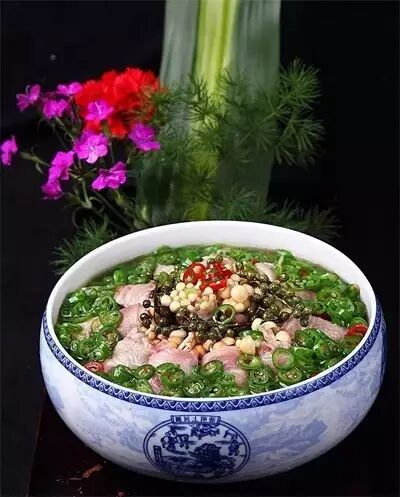 3、往锅里倒入韭菜汁,烧开后加盐、鸡粉、美极鲜酱油和辣鲜露调好味,出锅倒在盛有肥牛卷的盘内,最后舀上用热油炝香的青椒圈和青花椒,即成。