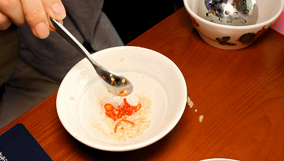 撒上红艳的辣椒碎,浇上秘制的酱油,一份完美蘸酱get!