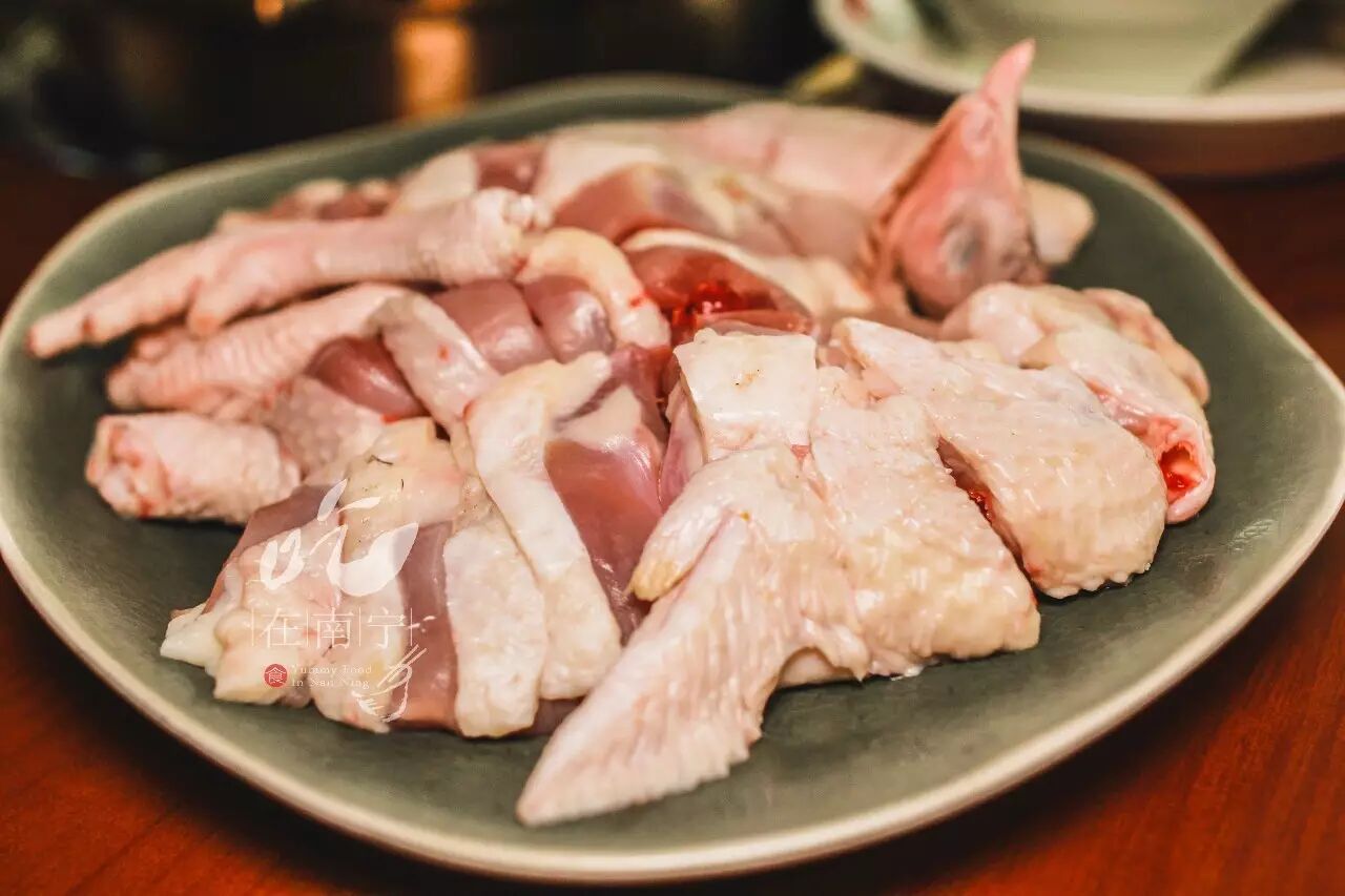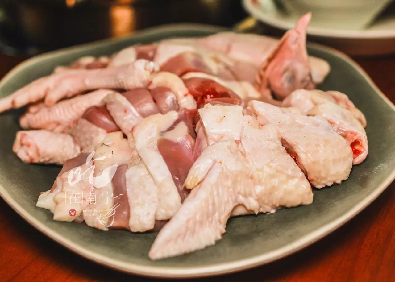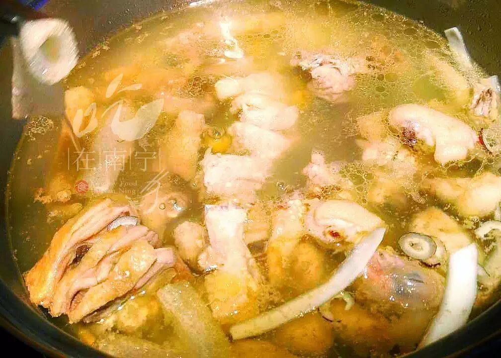 甘甜的锅底煮开,就可以把鸡肉放进去了。